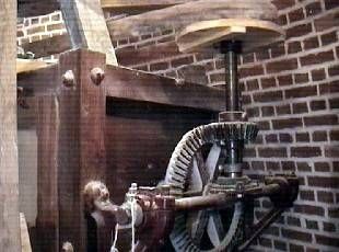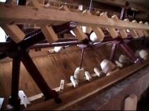 Sur chaque rayon glisse une masselotte de bois arrondie que la rotation fait tomber contre l'armature extérieure, la masselotte retombe ensuite sur l'axe, puis à nouveau contre la paroi, et ainsi de suite pour chaque rayon à chaque section. Ces multiples chocs en cadence favorisent le passage de la mouture à travers les soies.
